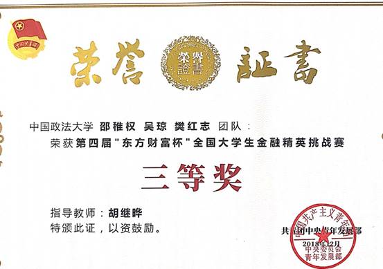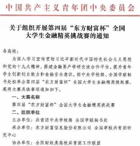 由团中央公司部、全国学联秘书处主办,东方财富信息股份有限公司、全国公司共青团研究中心承办,全国财经类高校共青团工作联盟协办,Choice数据提供数据支持的第四届“东方财富杯”全国老员工金融精英挑战赛于2018年6月20日正式启动报名,到2018年12月21日比赛正式结束,历时足足半年。在球盟会成福蕊老师的带领下,来自公司各专业的三百多名同学参与此项竞赛,多位校内教师参与竞赛指导,最终公司员工喜获十三项国家级奖励。
