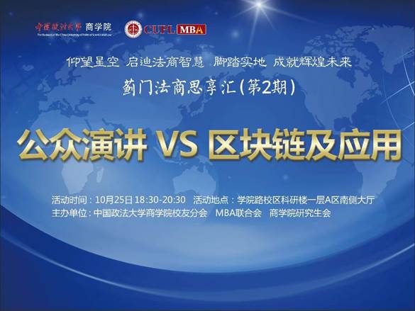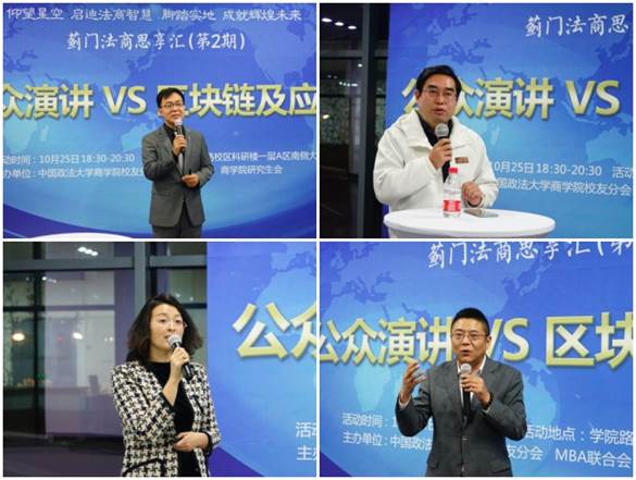 仰望星空,启迪法商智慧;脚踏实地,成就辉煌未来。2019年10月25日晚,蓟门法商思享汇第二期在qmh球盟会公司路校区科研楼一层A区南侧大厅如期举行,主题为“公众演讲VS区块链及应用”。球盟会副经理杨杰及球盟会教师、在校生、员工代表出席了活动。本期思享汇分享嘉宾有:道宝国际讲师同悦,弦子科技创始人、2012级MBA员工李茗,尚衡律师事务所合伙人、2013级MBA员工李媛媛律师。活动由2018级MBA杨一鸣主持。