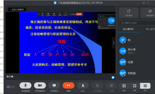 刘纪鹏经理和杨杰副经理高度重视第一周的线上授课情况,在授课前多次通过在线会议及微信等多种方式要求授课教师提高思想认识,授课结束后多次询问授课教师及员工的授课感受。为了更好地保证线上课程的顺利进行,他们进入学习通系统随机听取了个别老师的课程,对老师们的课程大纲、教学内容、与员工的互动情况、线上课程的技术支持进行临时的督导检查。通过督导可见公司教师都高度重视此次教学模式的调整,为线上课程做了充足的准备,严格按照公司要求,丰富教学内容,规范教学大纲,与员工积极互动交流,运用多种在线互动学习手段,保证球盟会的线上课程内容上丰富,技术上不出现任何的教学事故。