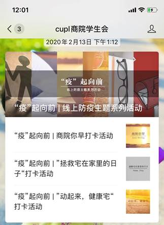 党有号召,团有行动。分团委也通过带领各班开展主题团日及主题班会活动,宣传防疫知识、弘扬抗疫期间先进事迹,弘扬正能量,同时还策划了“‘疫’起向前”线上防疫主题系列活动。其中“小宅的一天”防疫知识宣传、“27号信箱”文学艺术评论互动、“商院你早”每日学习打卡、“健康宅,动起来”每日运动打卡、“拯救宅在家的日子”趣味小技能等线上活动已于2月中旬陆续推出,用以丰富员工在家的日常生活,培养在家的健康生活学习习惯。