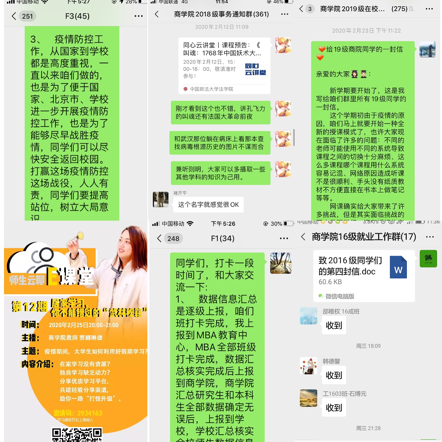 除了疫情防控数据统计工作,为帮助员工们更好地适应特殊时期的学习与生活,各个年级的辅导员也为员工们开展了富有特色的思想工作:2019级辅导员结合网络开课的现实背景,撰写《给19级商院同学的一封信》,帮助同学们增强网络授课适应性;2018级辅导员推荐优质的、多样性的网课给同学们,和同学们一起进直播间听课,和大家增加互动,深入了解员工的思想状态;2016级辅导员针对当前防疫工作和毕业班特点,专门撰写《致2016级全体同学的一封信》,鼓励同学们在做好安全防护的同时积极准备接下来的求职就业;双学士辅导员积极参加师生云聊E课堂活动,指导员工如何利用好假期进行学习;MBA学工办积极开展思想工作,引导员工树立大局意识,弘扬奉献精神,在不同地区、以不同方式为打赢疫情防控阻击战作出贡献,成效显著。同时,为切实给员工们提供帮助、解决实际问题,学工队伍已协助本院6名受疫情影响严重员工向公司提出临时补助申请,共获补助1.3万元。