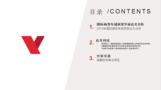随后,张婷婷老师帮助同学们分析了2019年国际商务专硕教指委获奖毕业论文,指出论文选题不能过大、过空、过泛、过浅、过旧,要寻找自己能力范围内重要的实践问题,从学术角度出发,做具有现实意义的研究选题。通过分析优秀毕业论文的选题特征、研究方法、写作思路,张婷婷老师建议同学们突出国际商务的“国际性”选题,强调了选题应具有实际意义,解决实际问题。提醒同学们,论文所选用的研究方法应与研究问题相匹配,恰当合理地使用定性分析和定量分析。此外,张婷婷老师还就毕业论文的思路和框架做出详尽的介绍,并强调了学术道德和学术规范的重要性。