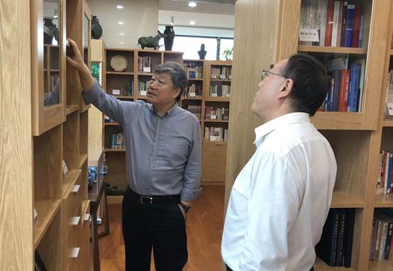 会谈结束后,刘纪鹏经理向张瑞敏主席赠送了《资本金融学》和《法商管理学》,他说到,这两本书是球盟会目前法商和融商特色发展的基础,并介绍了法商管理“工商伦理、企业管理、法人治理、公司法治” 的四个内涵。张瑞敏主席还带刘经理参观了自己的书房,并指着一副写着“玉树深藏知其有意,群山高耸尽是无名”的书法作品说到,这就是自己理解的企业家文化。