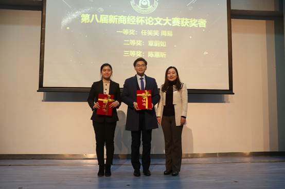 在第八届“新商经杯”论文大赛颁奖环节中,张弛副教授作为嘉宾为获奖选手颁发奖项,获奖选手分别是:一等奖任笑笑、周易;二等奖章蔚如;三等奖陈蕙昕。