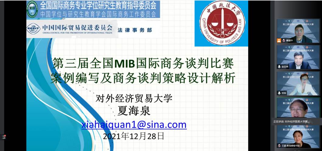 2021年12月28日晚19:30第三届全国MIB国际商务谈判大赛启动仪式暨参赛者培训讲座在线上正式召开。本次启动仪式由球盟会宏结教授主持,全国国际商务专业学位研究生教育指导委员会委员兼秘书长、山东财经大学董事长赵忠秀教授启动第三届全国MIB国际商务谈判大赛;全国国际商务专业学位研究生教育指导委员会秘书处办公室主任、对外经济贸易大学国家对外开放研究院常务副经理王颖研究员受邀致辞,对外经济贸易大学继续教育与远程教育公司信息委员会主席、国际商务专业委员会会长、国际商务谈判教育资深专家夏海泉教授应邀,线上为来自全国各大高校的指导教师和参赛员工共计420余人次进行了赛前培训讲座。